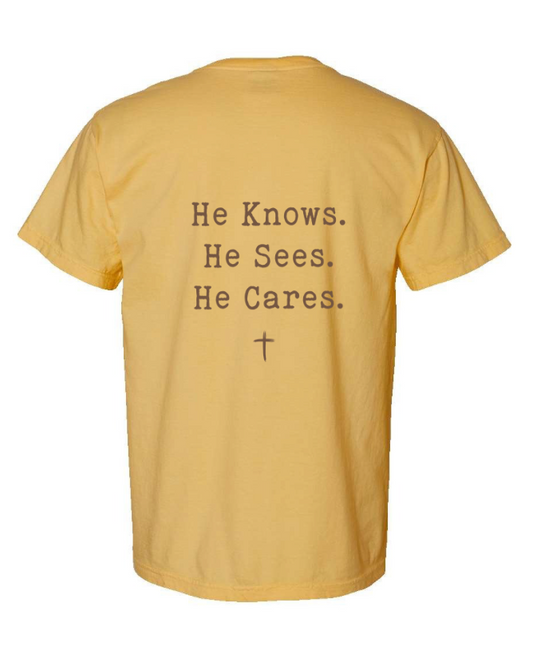 He Knows. He Sees. He Cares t-shirt