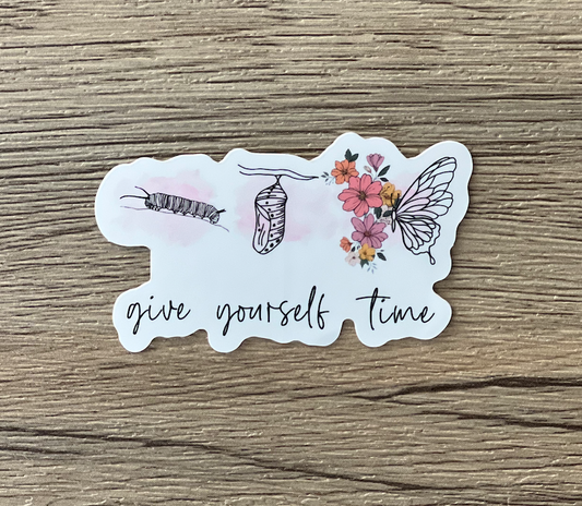 Give Yourself Time Waterproof Sticker with Caterpillar-to-Butterfly Image